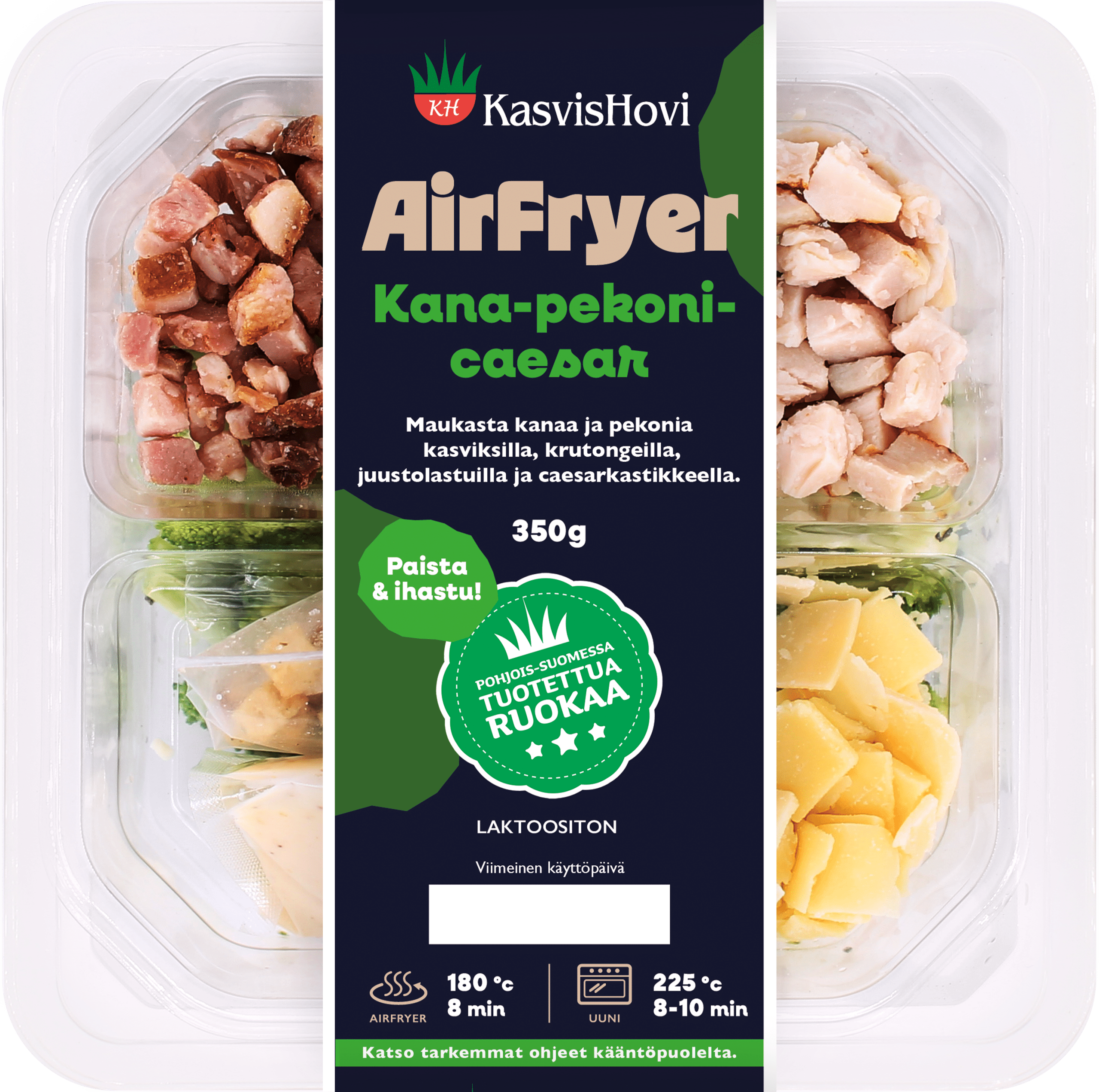 Maukasta kanaa ja pekonia kasviksilla, krutongeilla, juustolastuilla ja caesarkastikkeella. Valmistetaan paistamalla airfryerissa tai uunissa. Paista ja ihastu!